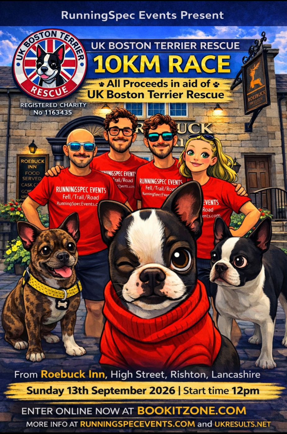 UK BOSTON TERRIER RESCUE 10KM RACE Sunday 13th September 2026, £13.40 pre entry, £15.40 unaffiliated 12pm, Roebuck Inn, High Street Rishton, Lancashire. Race Licence Applied For.Under UK Athletics Rules Minimum Age 16. ENTER ONLINE