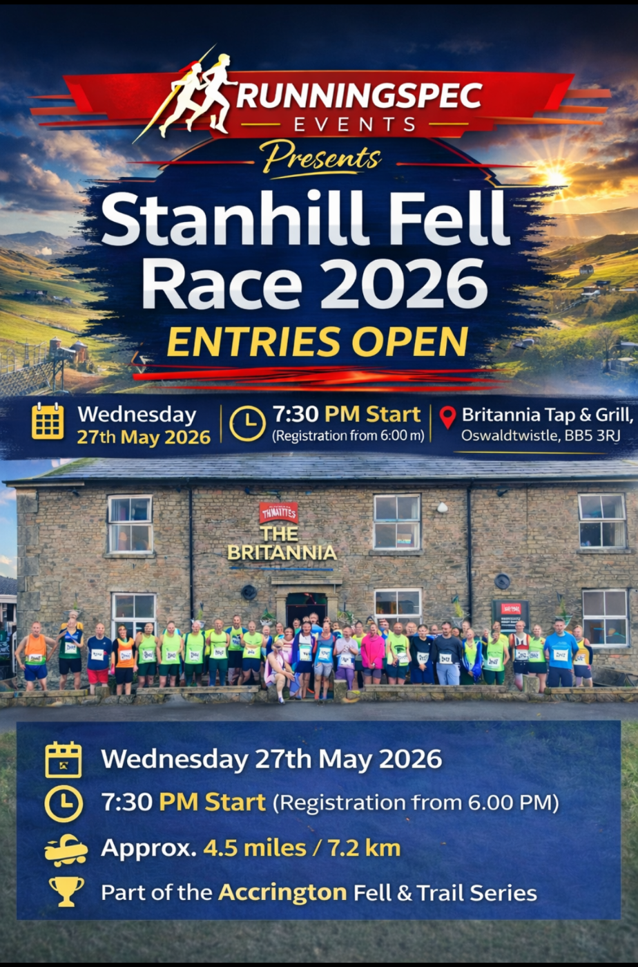 STANHILL FELL RACE Wednesday 27th May 2026, 7.30pm £6 Entry on the day, 4.5 mile, Brittania Tap & Grill, Haslingden Old Road, Oswaldtwistle, Lancashire. (Race 5 in Accrington Fell & Trail Series) FRA Race Licence Number applied for - 2025 RESULTS ENTER ONLINE