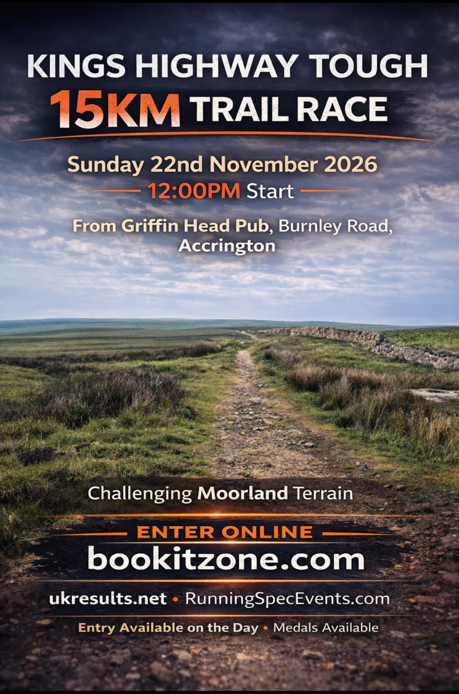 KING'S HIGHWAY TOUGH 15KM TRAIL RACE Sunday 22nd November 2026, £12 attached £14 unattached on the day 12pm, The Griffins Head, Burnley Road, huncoat, Accrington, Lancashire, BB5 6LD Race Licence Applied For.Under UK Athletics Rules Minimum Age 16.