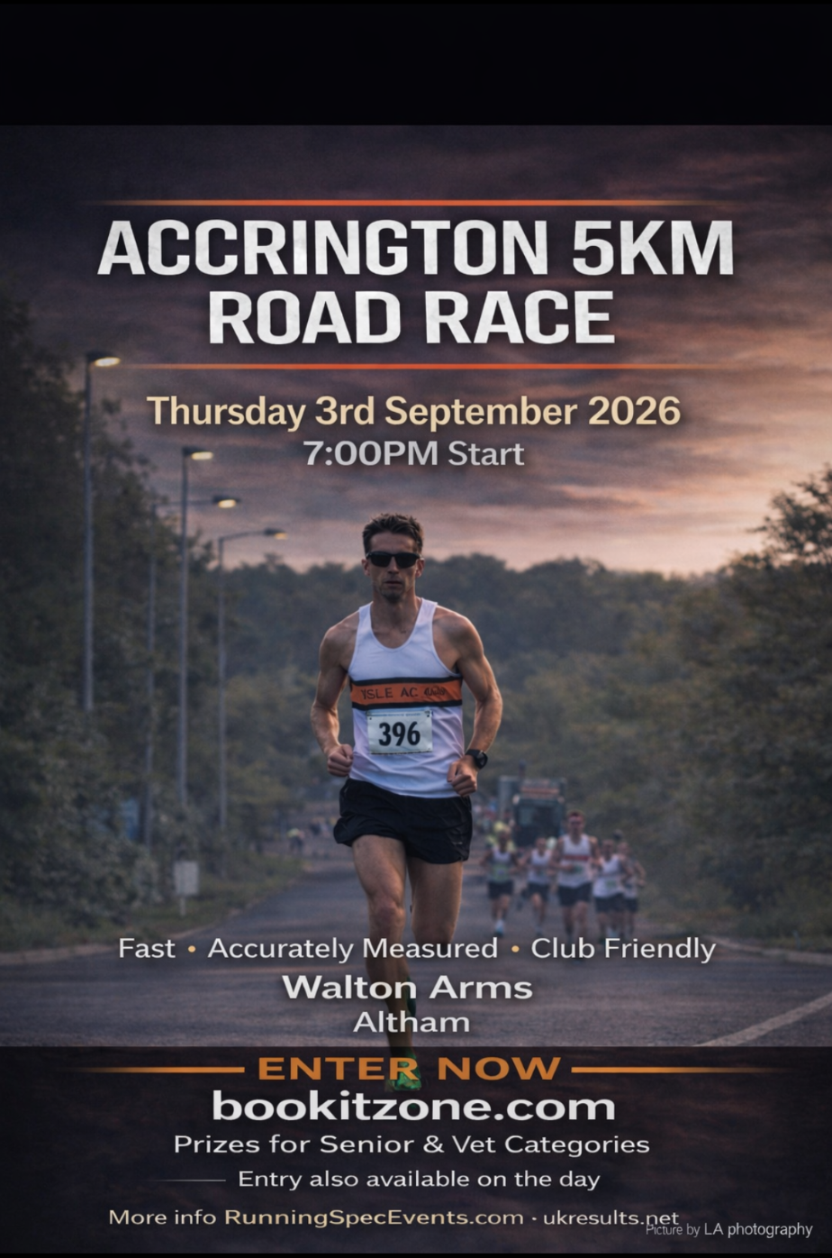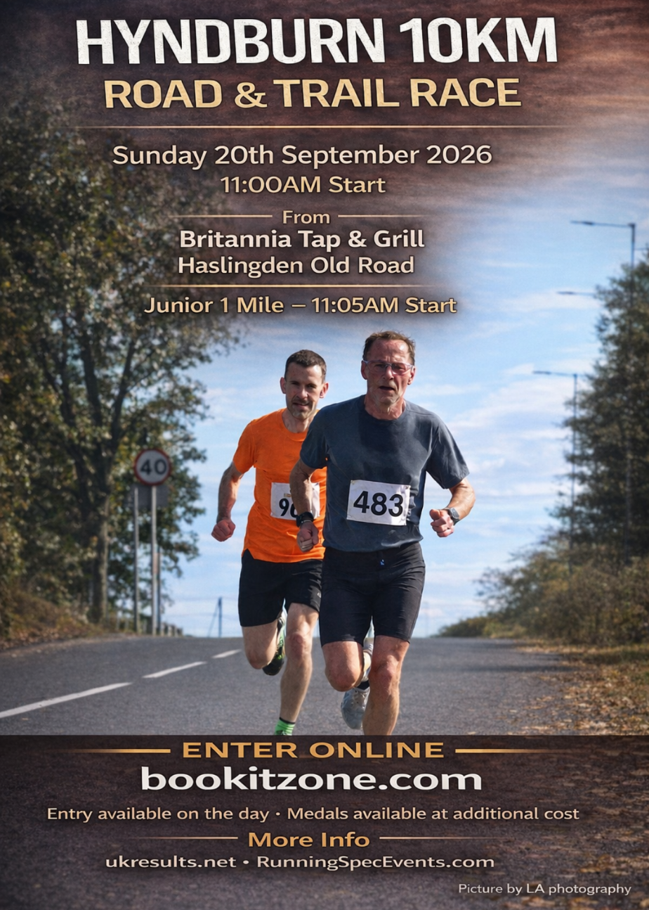 HYNDBURN 10KM ROAD/TRAIL RACE Sunday 20th September 2026, £8.40 pre entry or £10 on the day, £12 unaffiliated 11am, Britannia Tap & Grill Oswaldtwistle, Lancashire. Race Licence Applied For.Under UK Athletics Rules Minimum Age 16. 2025 RESULTS ENTER ONLINE