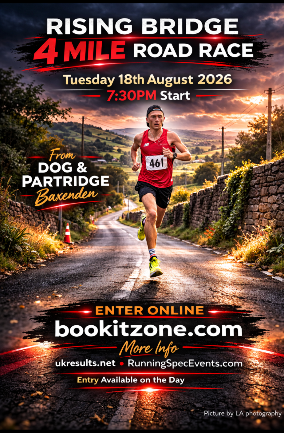 RISING BRIDGE 4 MILE ROAD RACE Tuesday 18th August 2026, £6.40 pre entry or £8 Entry on the day, 7.30pm, Dog & Partridge, Back Lane, Baxenden, Accrington, Lancashire. Race Licence Applied For. 2025 RESULTS ENTER ONLINE